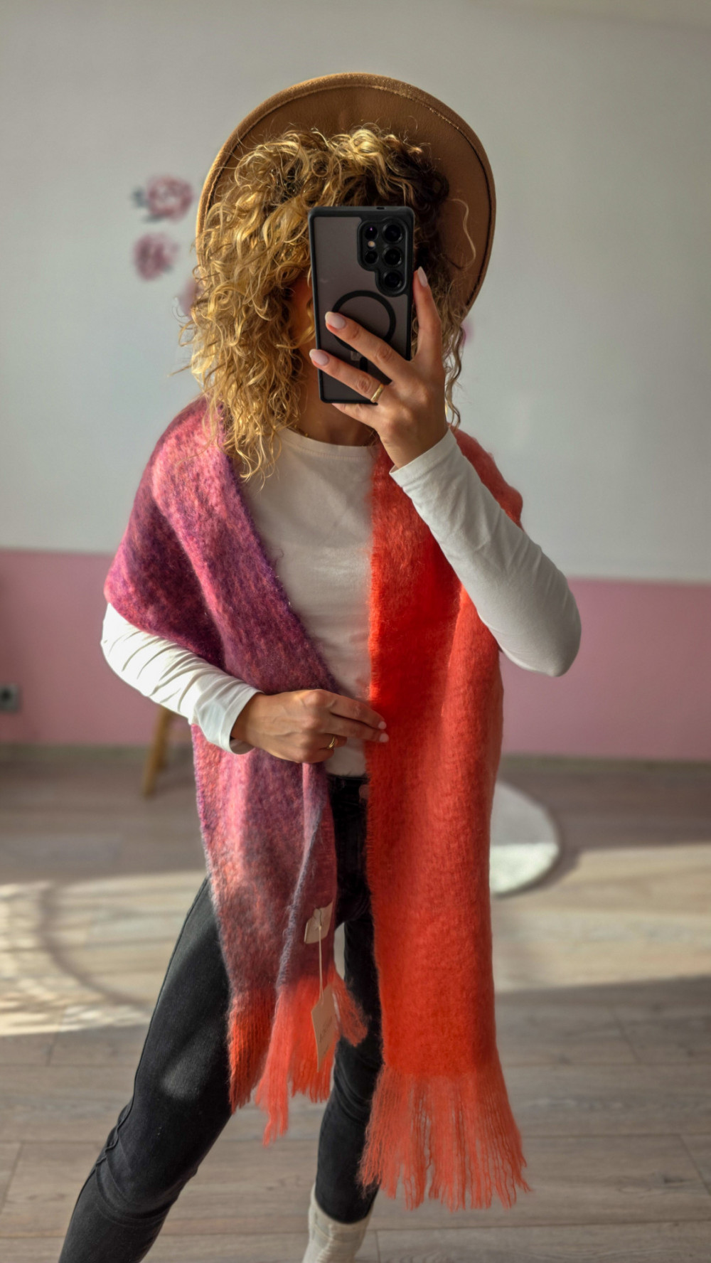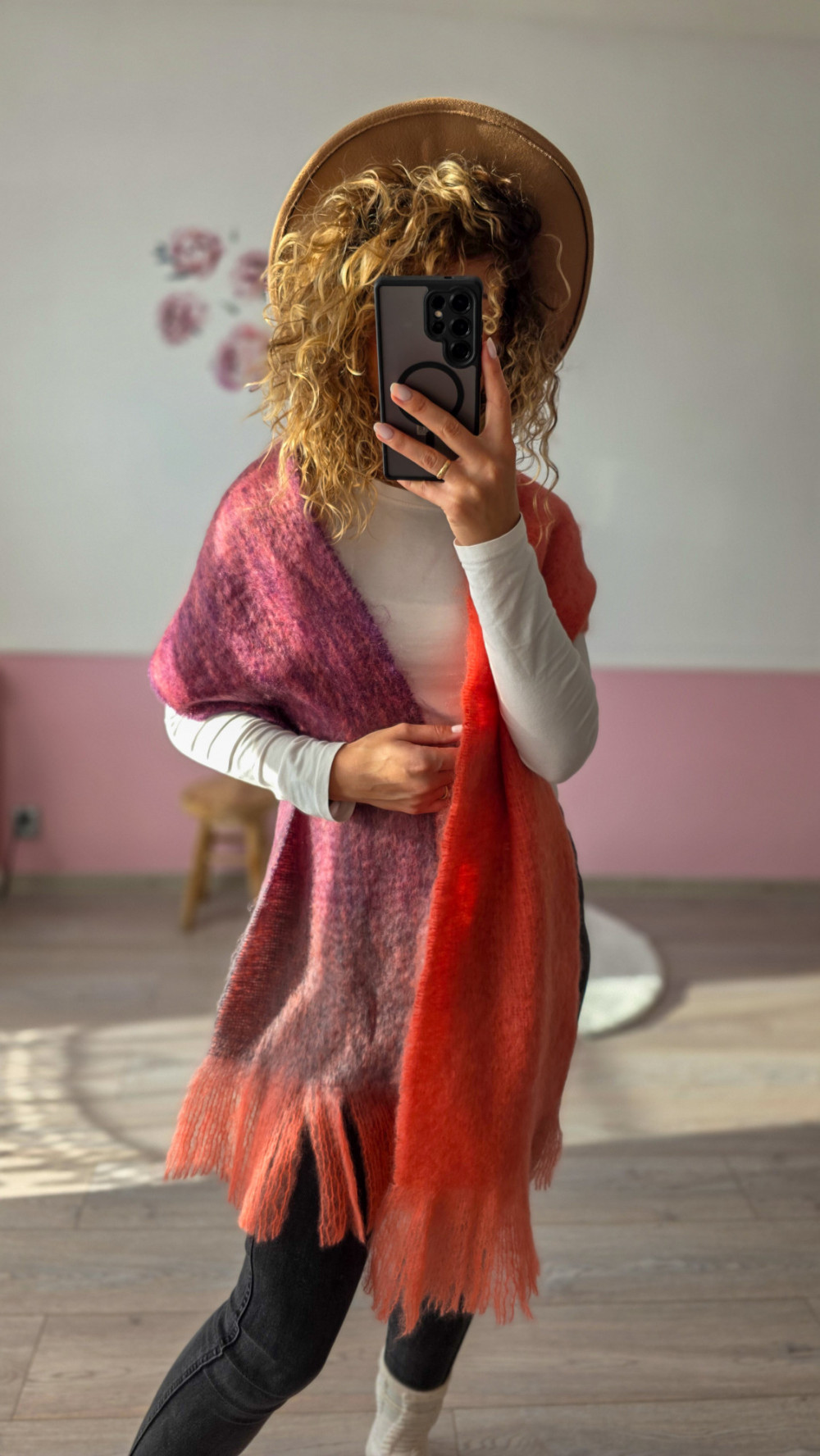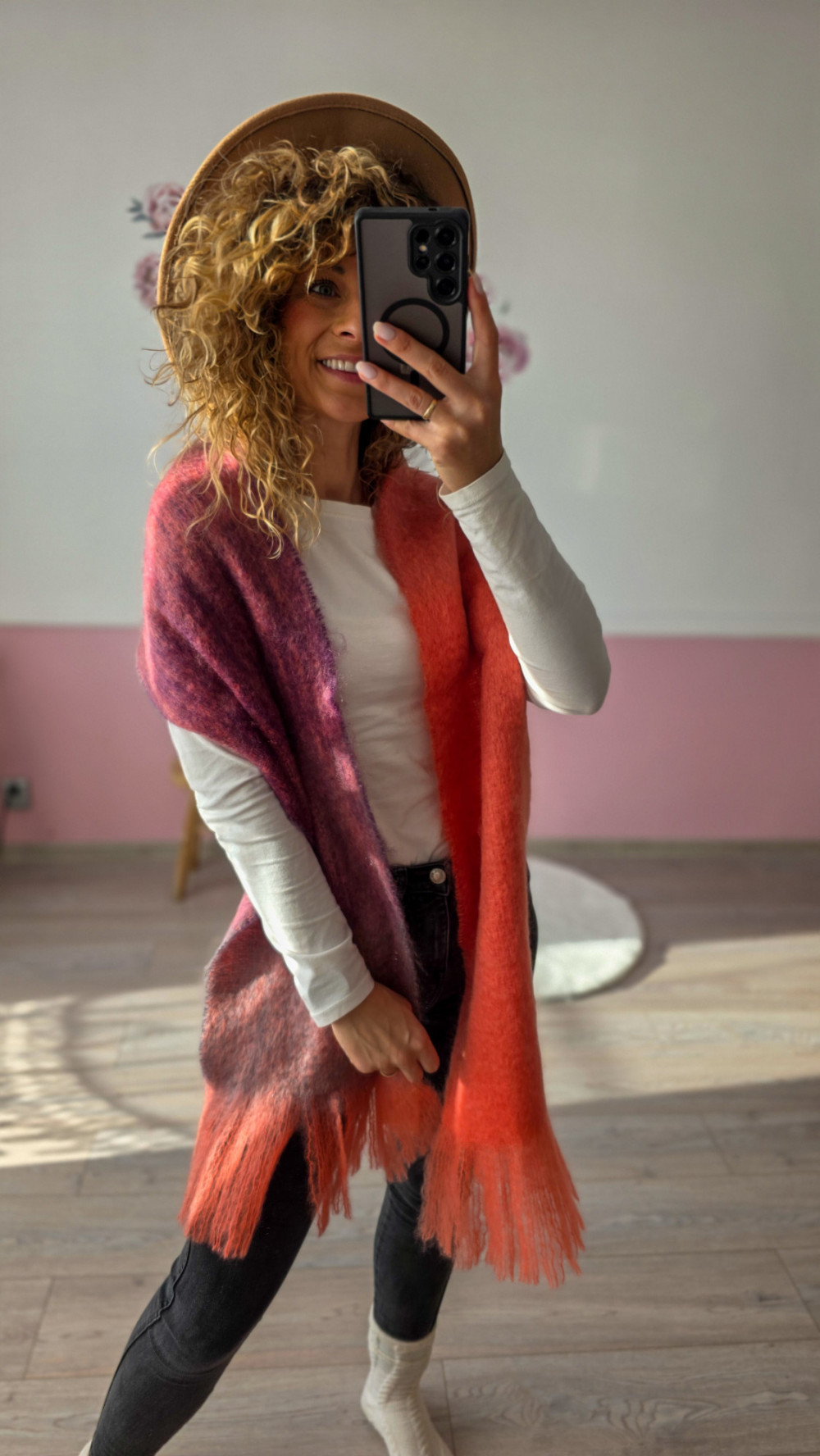 Efektowne przejście kolorów w odcieniach głębokiego różu, koralu i subtelnych szarości nadaje mu wyjątkowego charakteru i sprawia, że staje się on mocnym akcentem każdej stylizacji. Lekka, otulająca struktura pięknie układa się wokół szyi, dodając elegancji zarówno codziennym, jak i bardziej wyrafinowanym zestawom.