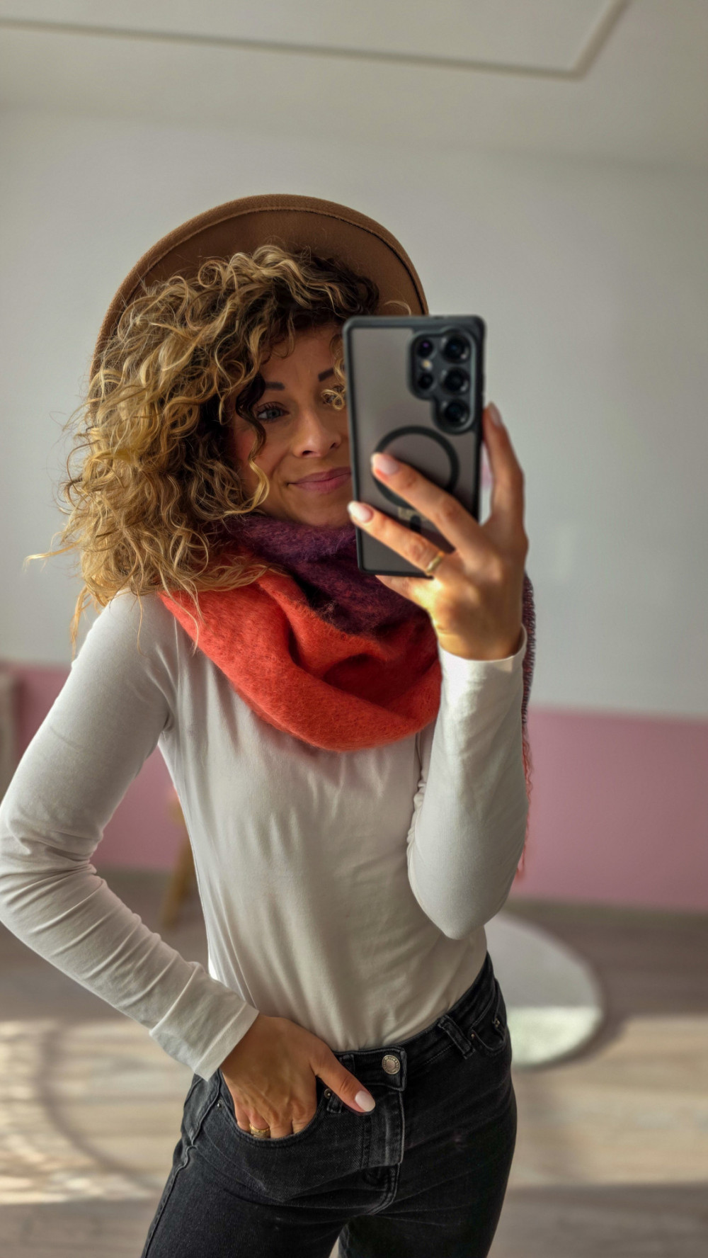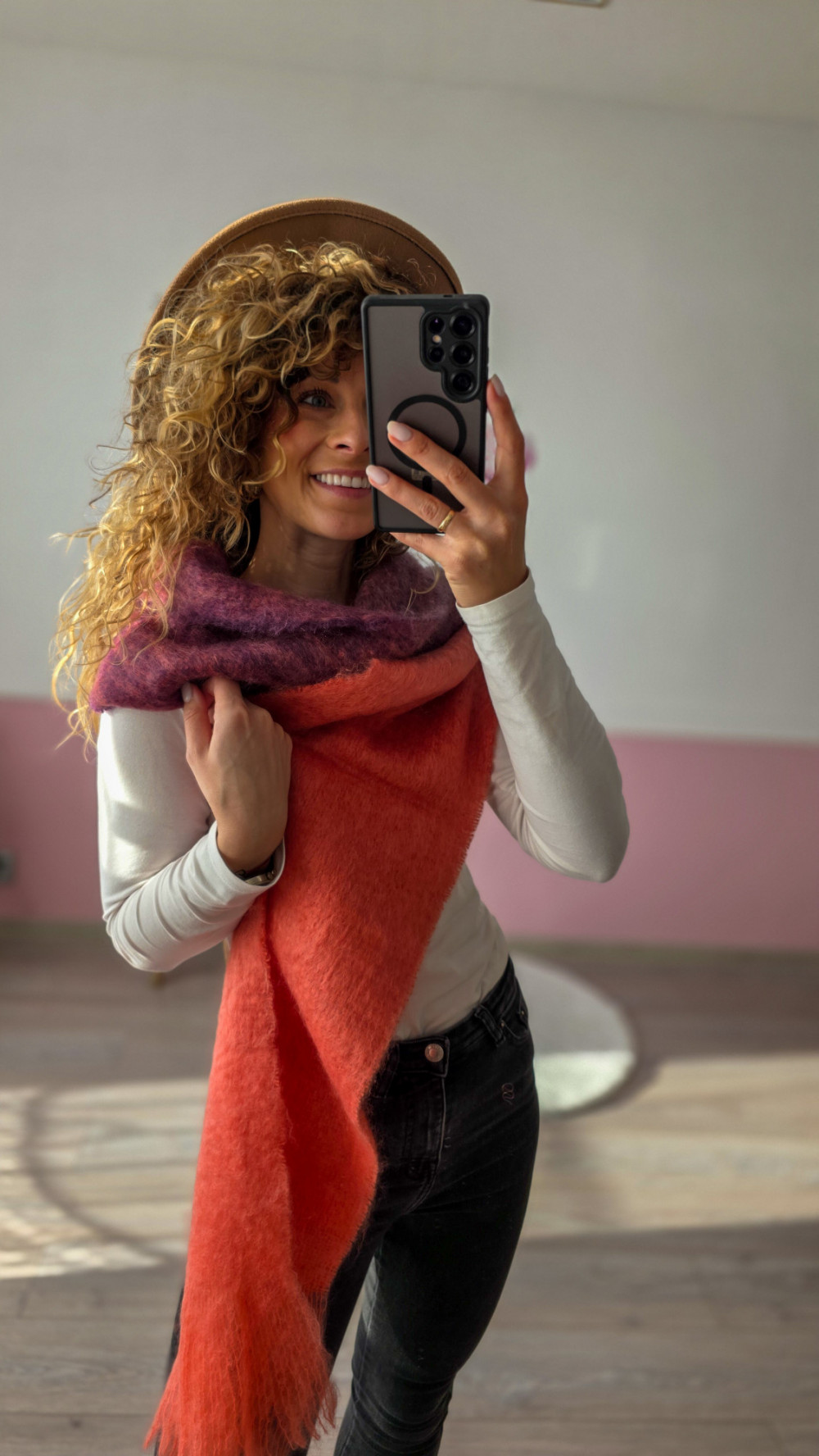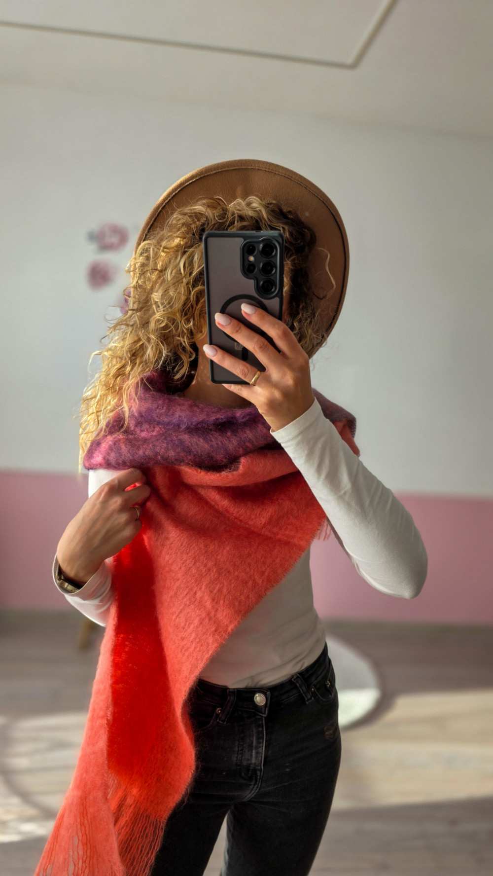 Efektowne przejście kolorów w odcieniach głębokiego różu, koralu i subtelnych szarości nadaje mu wyjątkowego charakteru i sprawia, że staje się on mocnym akcentem każdej stylizacji. Lekka, otulająca struktura pięknie układa się wokół szyi, dodając elegancji zarówno codziennym, jak i bardziej wyrafinowanym zestawom.