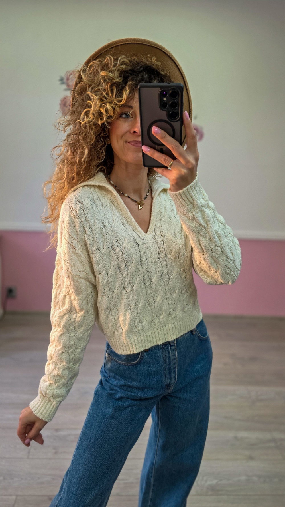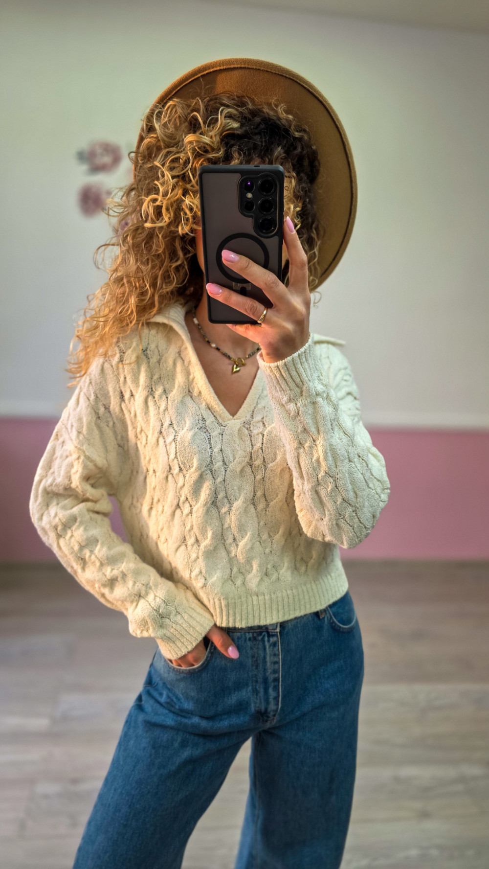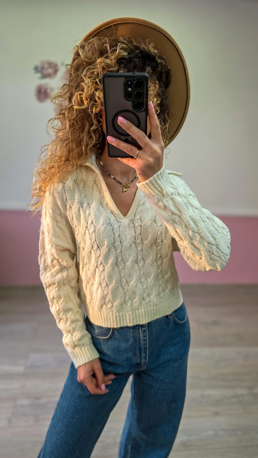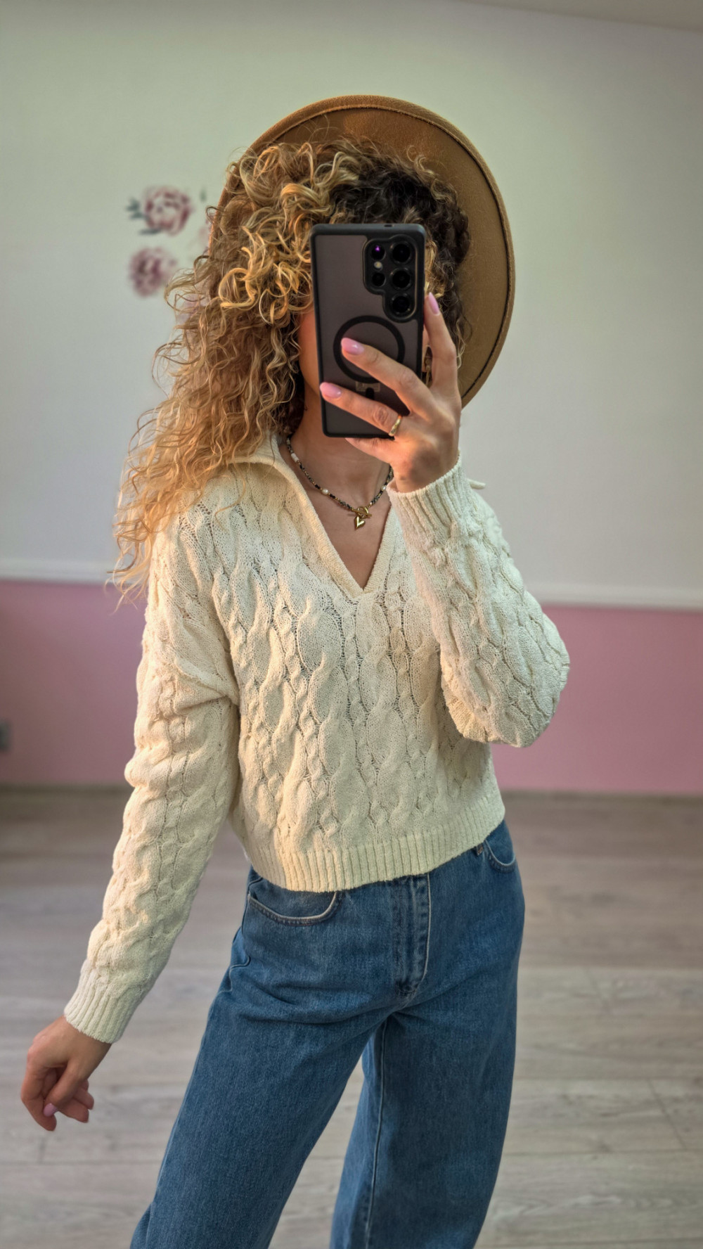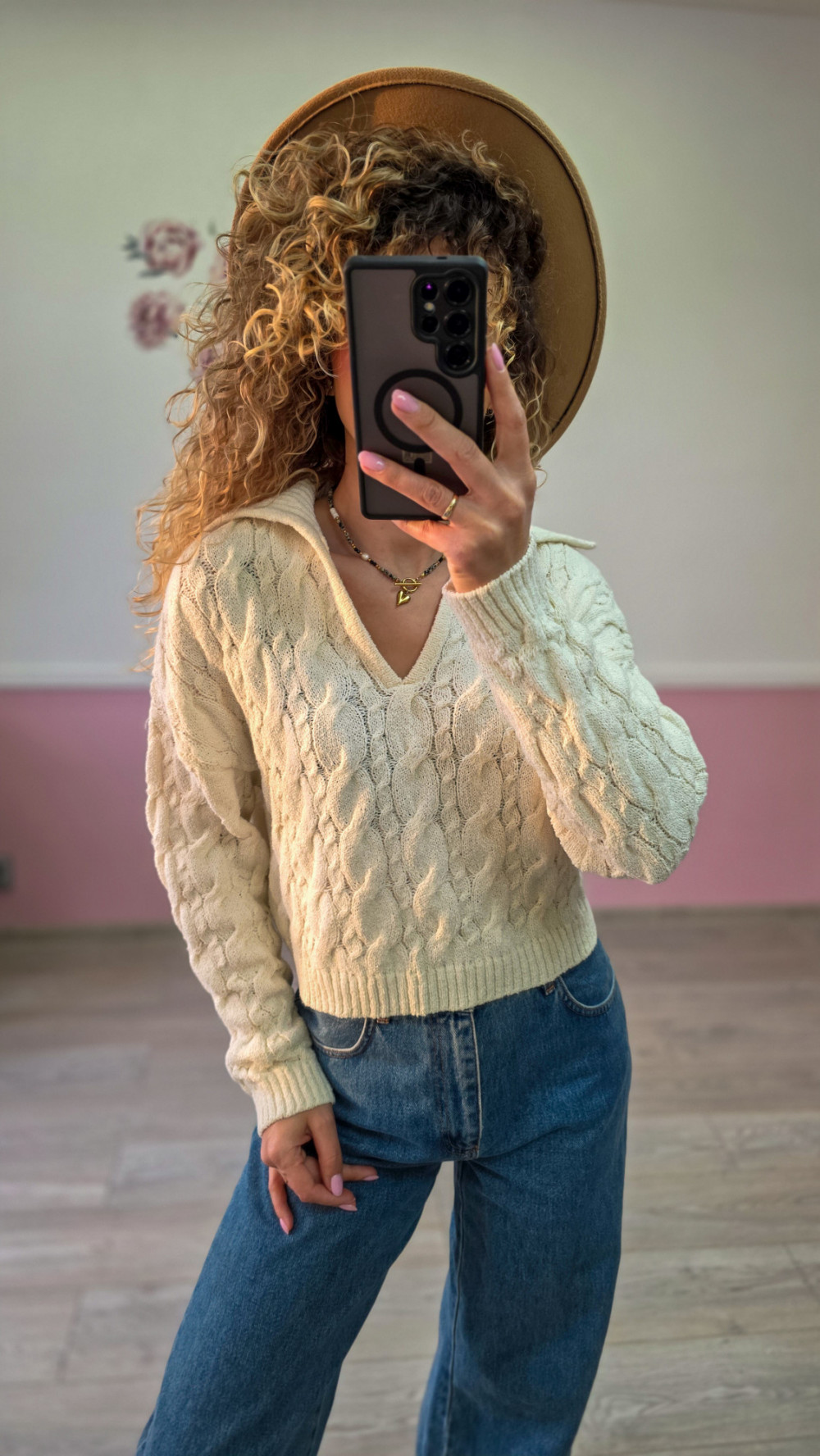 Sweter damski z dekoltem V – kremowy, dzianinowy, warkoczowy