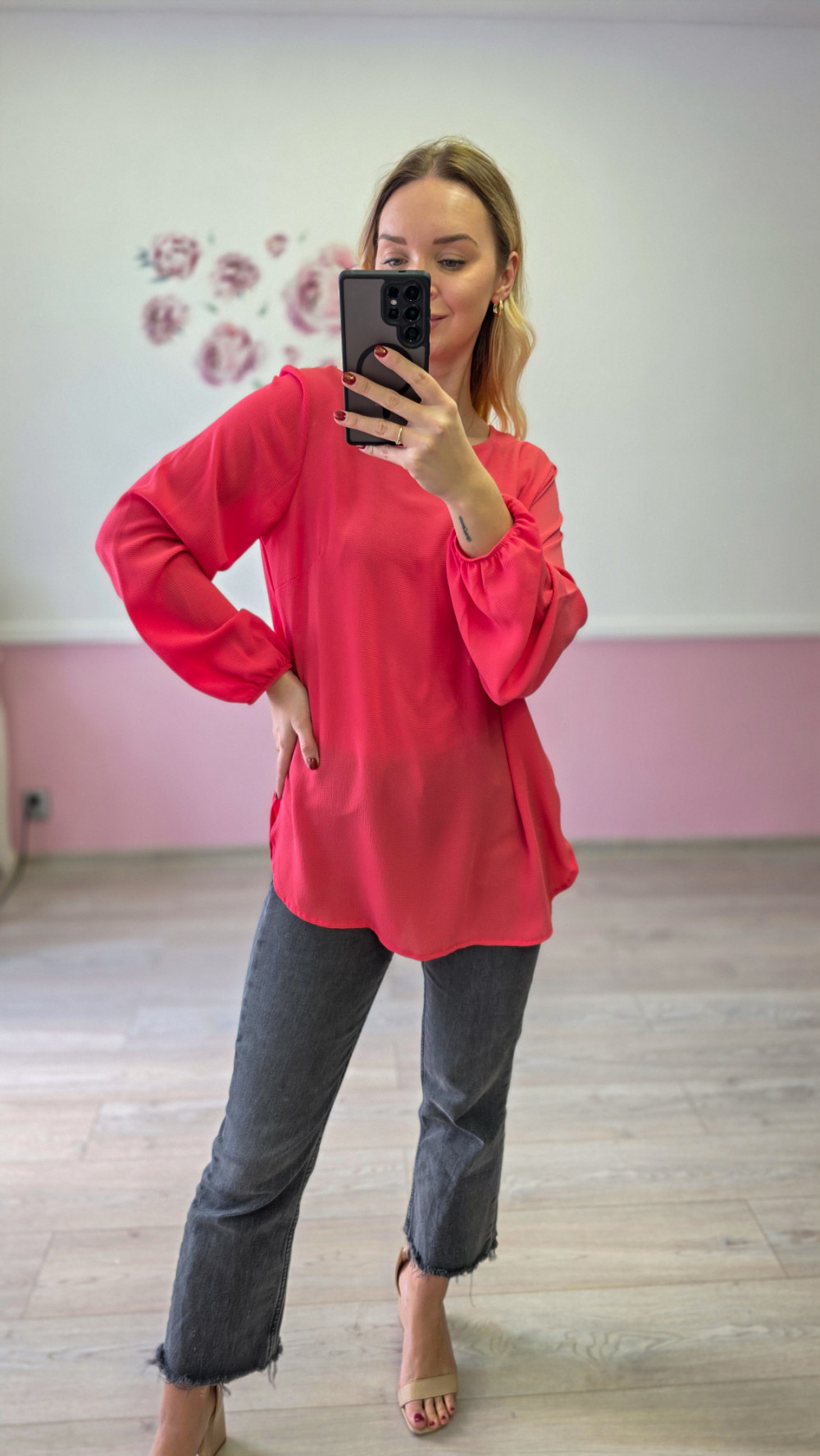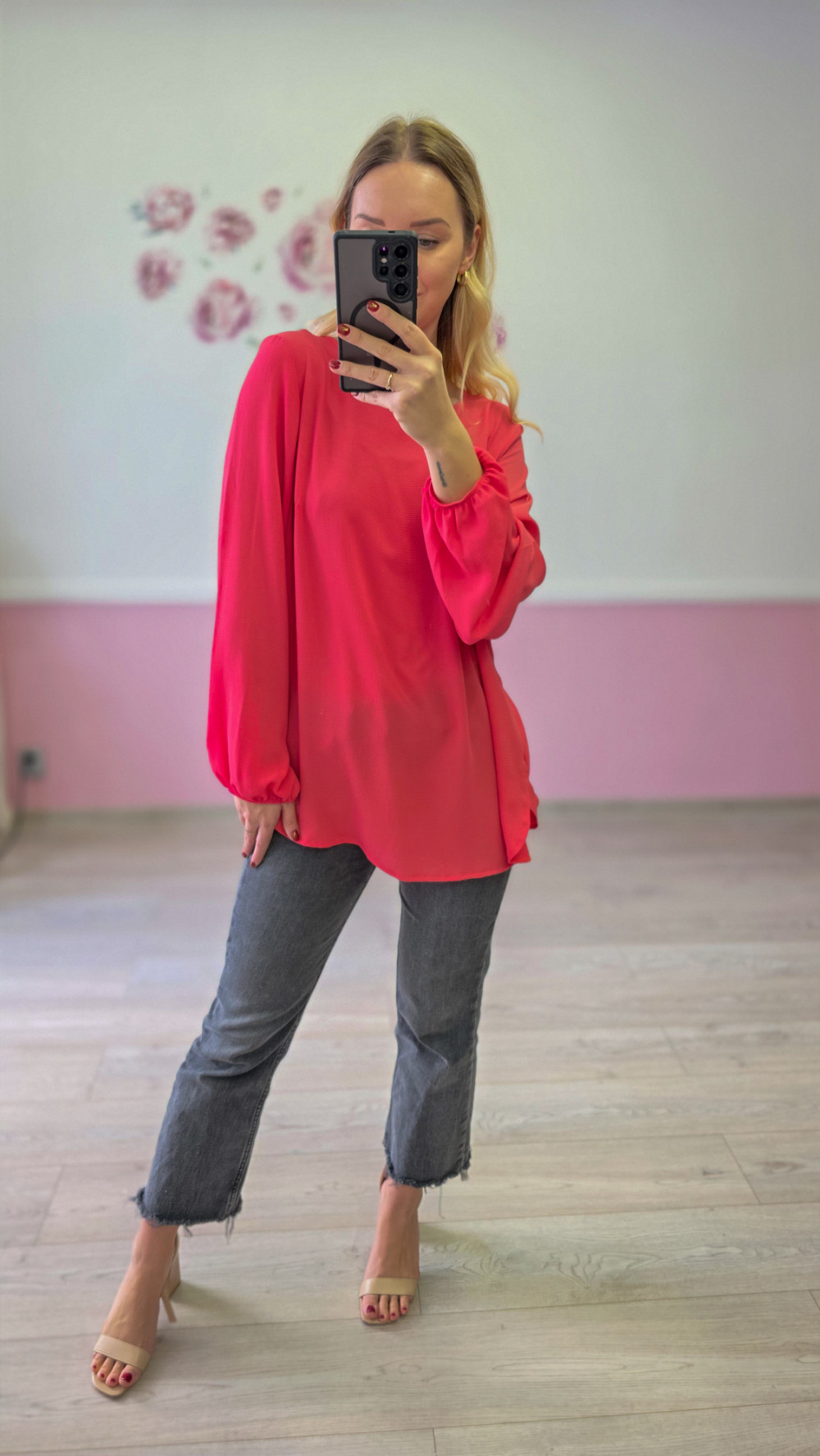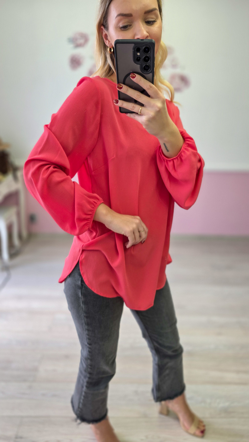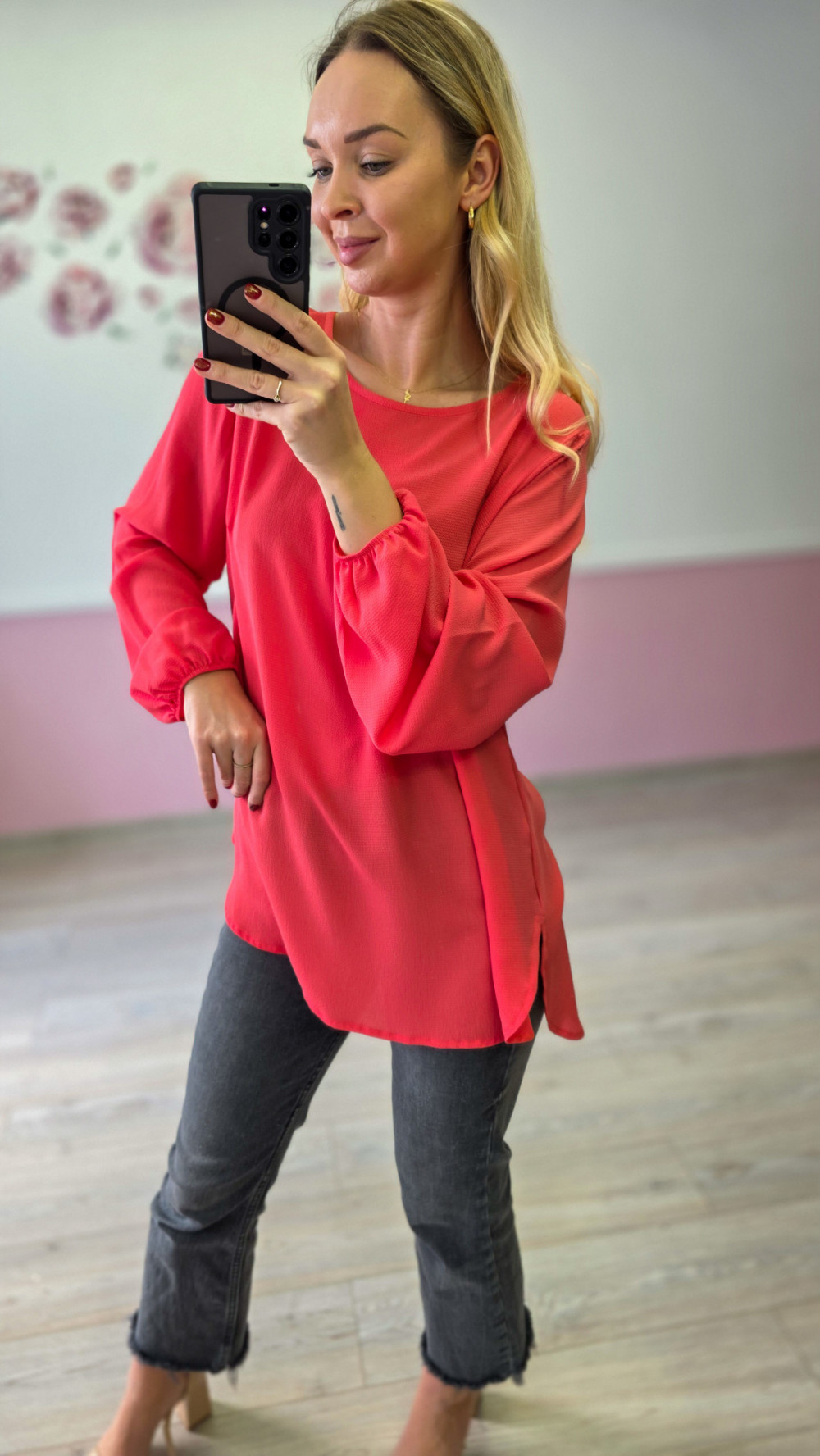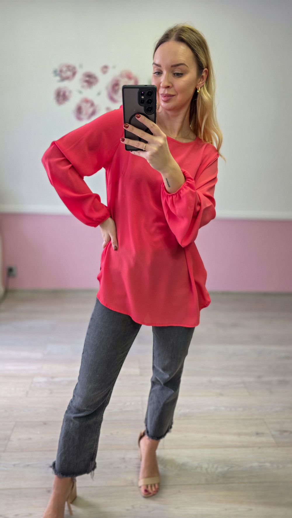 Czerwona bluzka damska z długim rękawem to efektowna propozycja, która doda energii każdej stylizacji. Lekki, przyjemny w noszeniu materiał subtelnie układa się na sylwetce, zapewniając komfort przez cały dzień. Luźniejszy krój sprawia, że bluzka prezentuje się swobodnie, a jednocześnie bardzo kobieco.