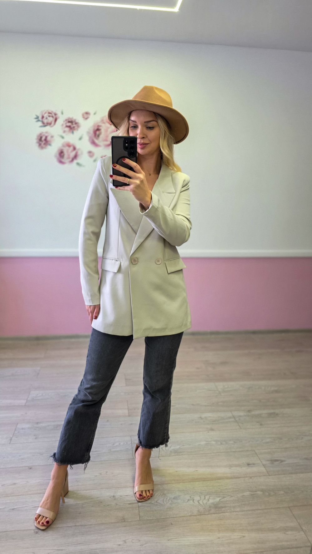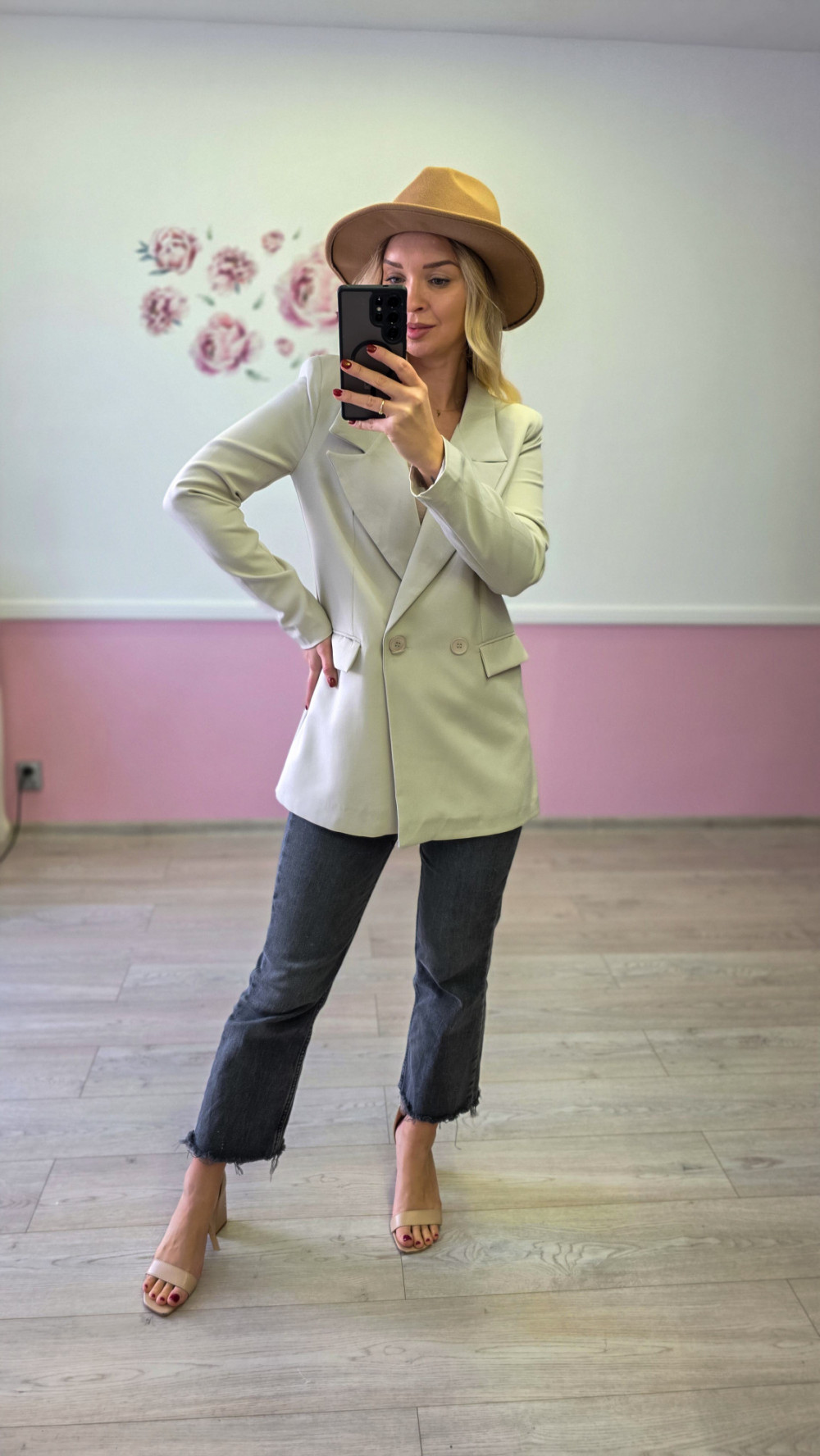 Beżowa marynarka damska dwurzędowa
