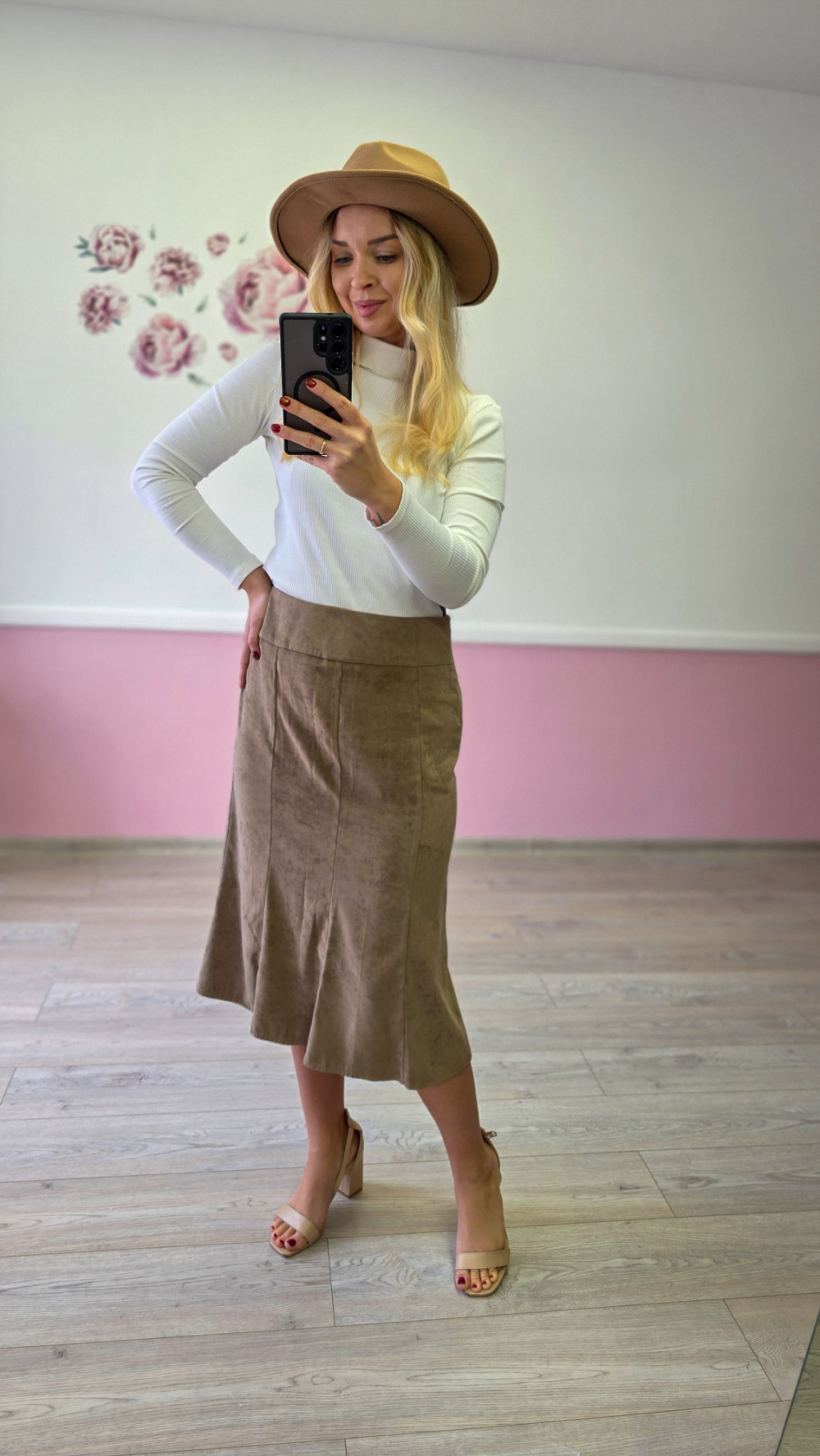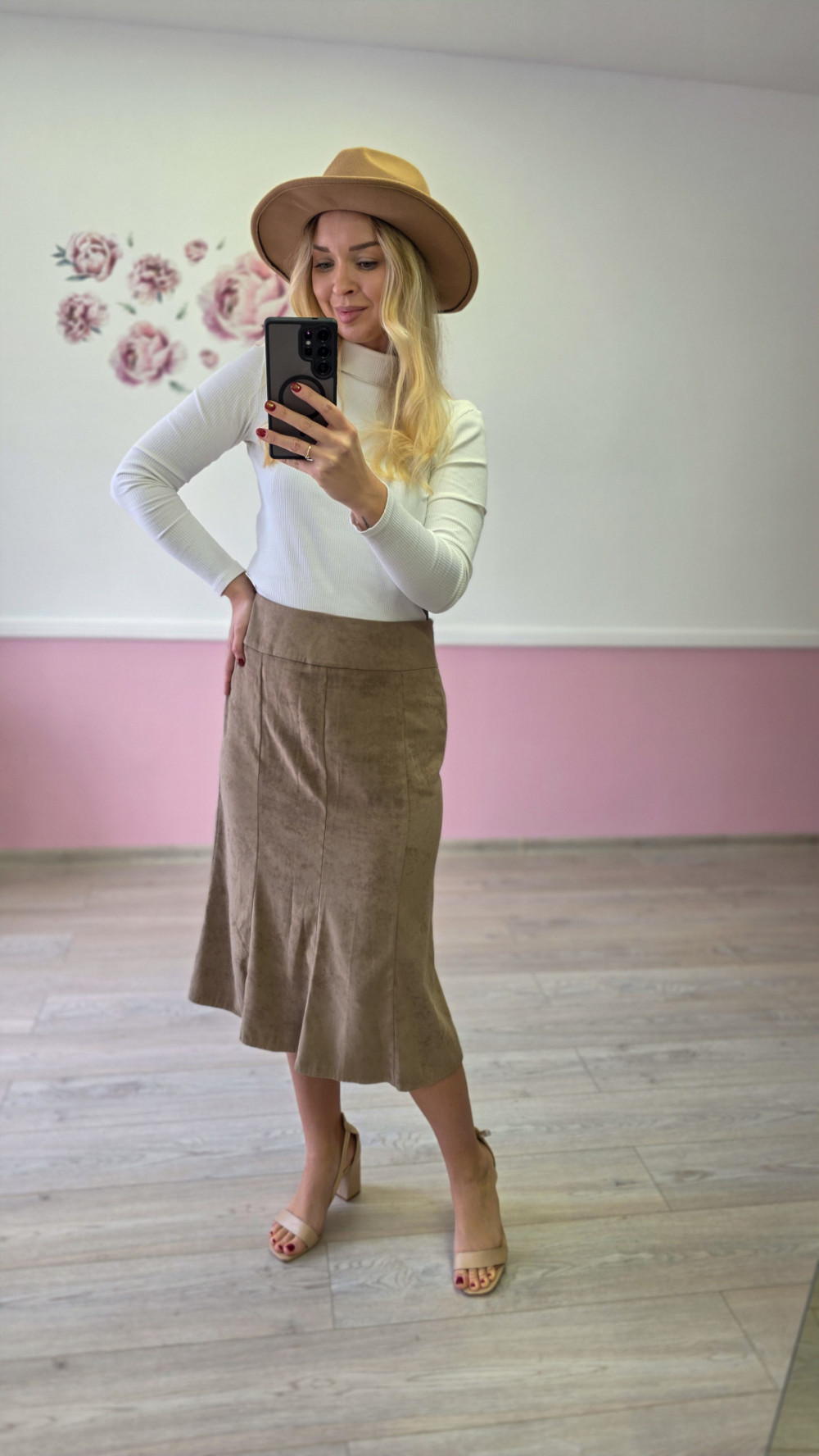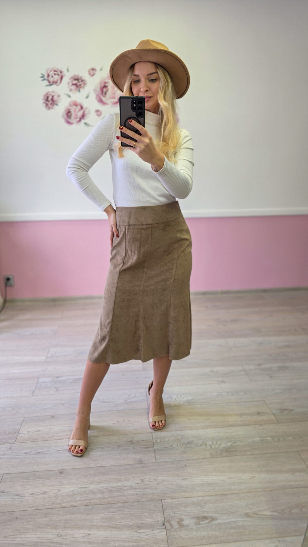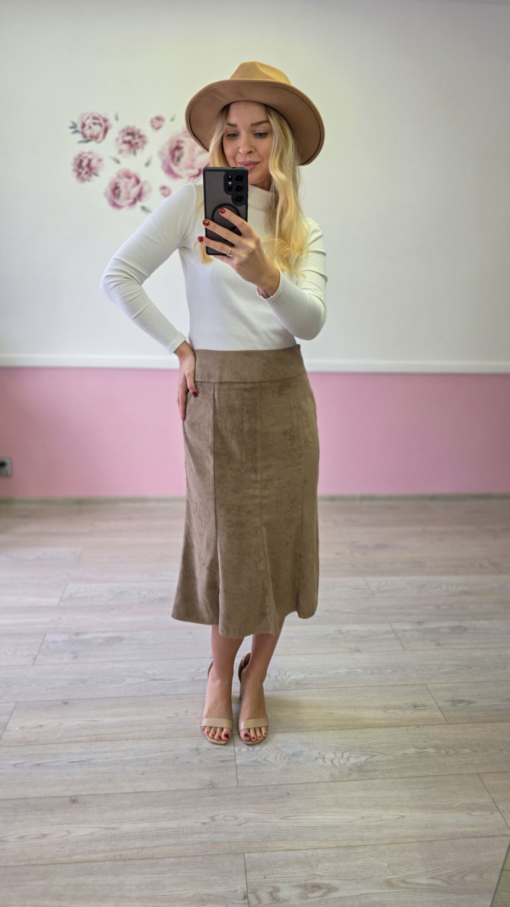 Beżowa spódnica zamszowa midi