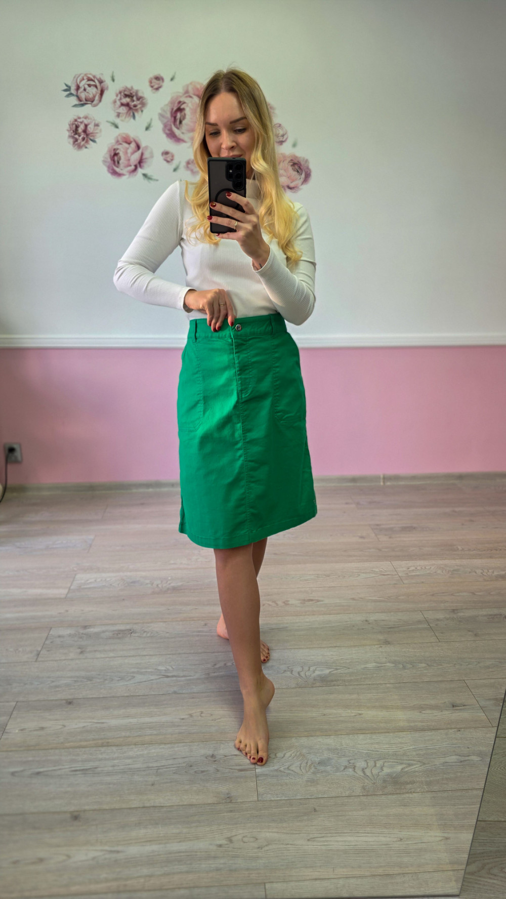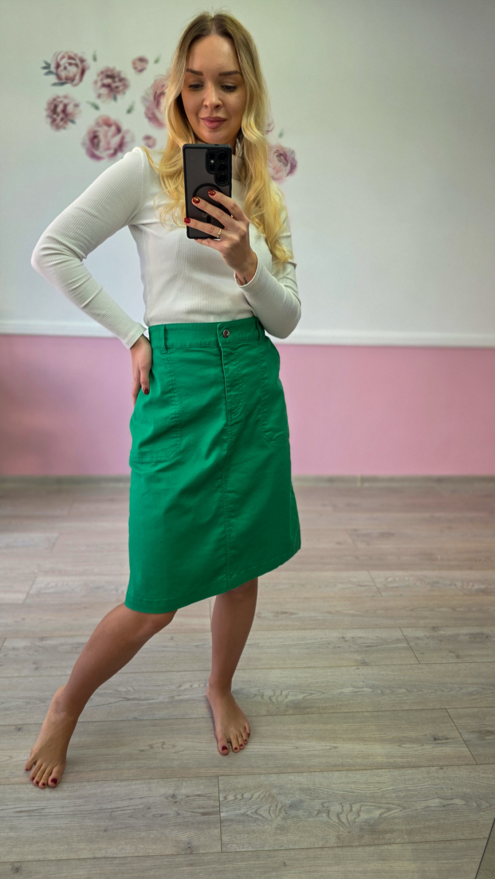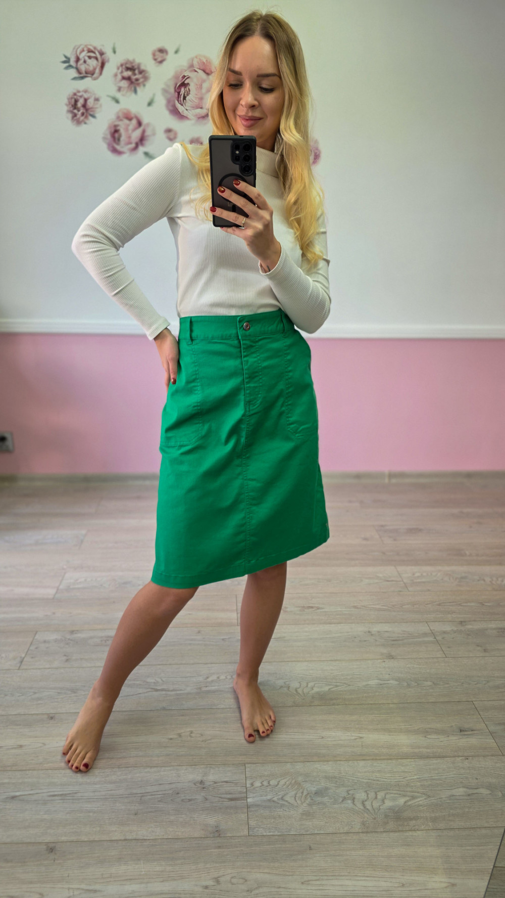 Klasyczna zielona spódnica midi to ponadczasowa propozycja dla kobiet ceniących elegancję i wygodę. Prosty fason zapewnia swobodę ruchów i estetyczne dopasowanie do sylwetki, a intensywny zielony kolor dodaje stylizacji świeżości i wyrazistości. Długość midi sprawia, że model prezentuje się bardzo uniwersalnie.