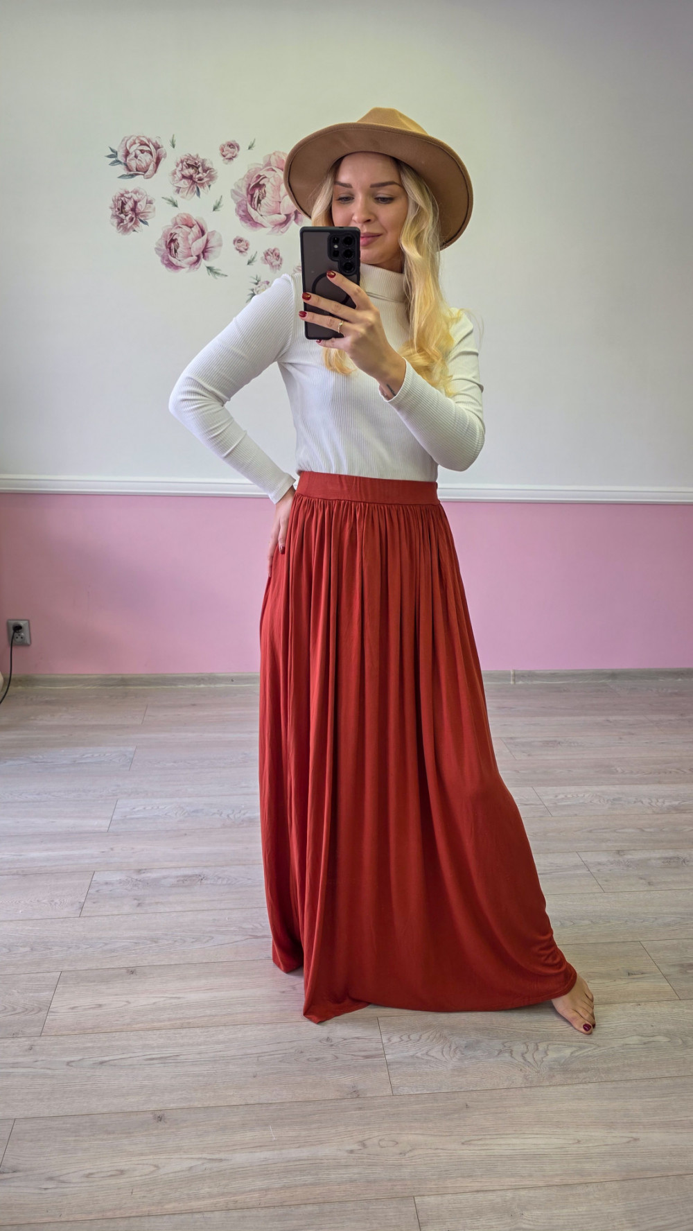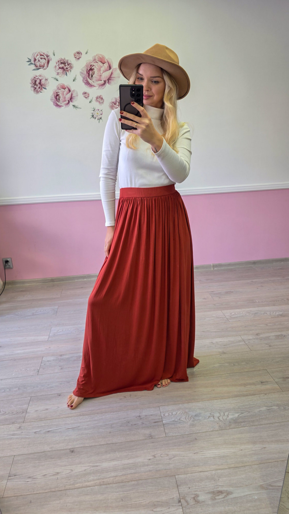 Efektowna długa spódnica w ciepłym, ceglastym odcieniu to propozycja dla kobiet, które cenią swobodę i kobiecy styl. Lekki, zwiewny materiał pięknie układa się w ruchu, a elastyczna gumka w pasie zapewnia wygodne dopasowanie do sylwetki. Długość maxi nadaje stylizacji elegancji i lekkości.