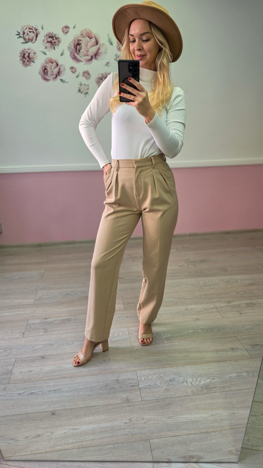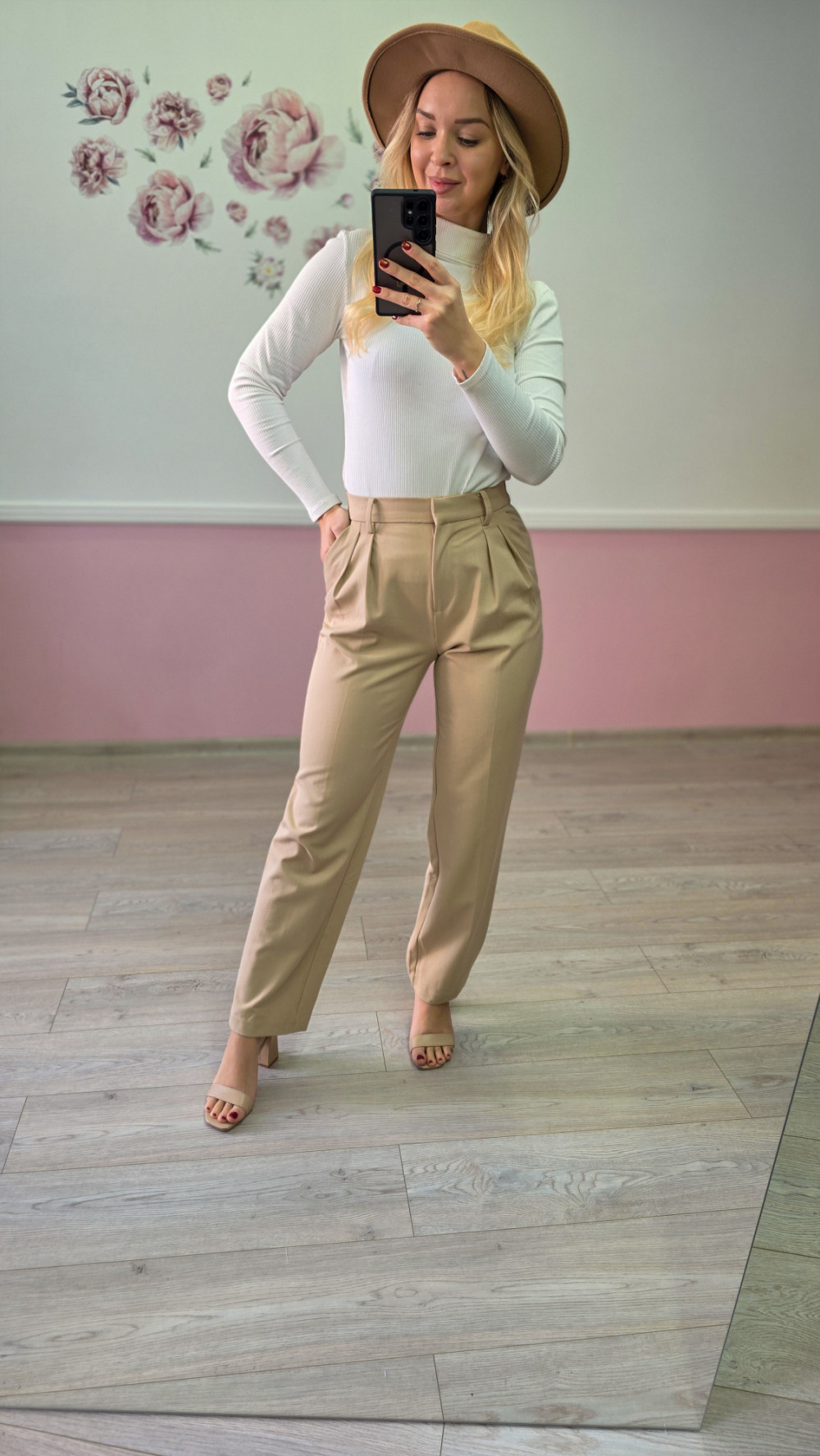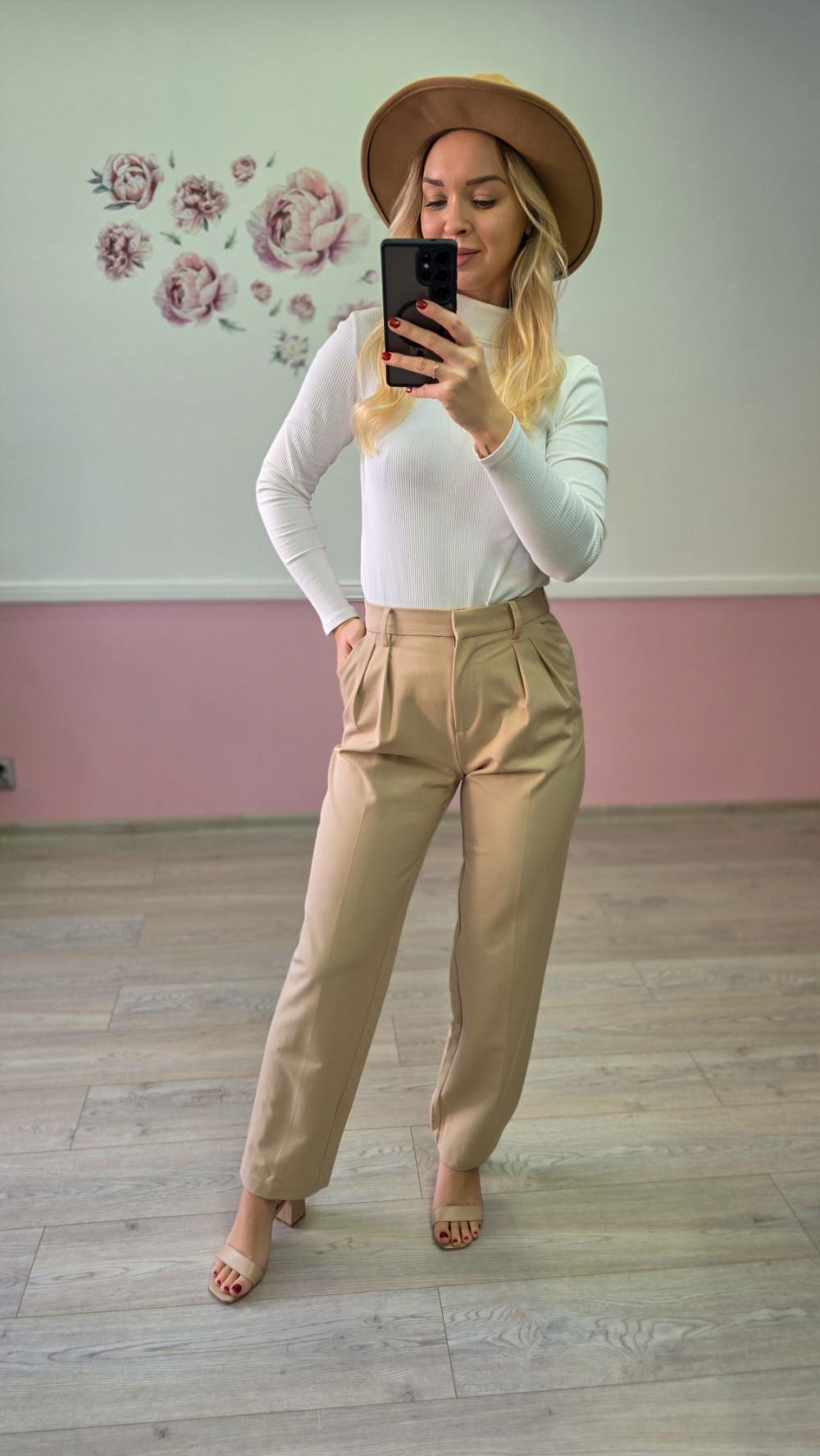 Eleganckie beżowe spodnie damskie to doskonały wybór dla kobiet ceniących klasykę w nowoczesnym wydaniu. Wysoki stan pięknie akcentuje talię, a prosty, lekko zwężany fason optycznie wysmukla sylwetkę. Neutralny, beżowy odcień sprawia, że spodnie są niezwykle uniwersalne i łatwe do stylizowania.