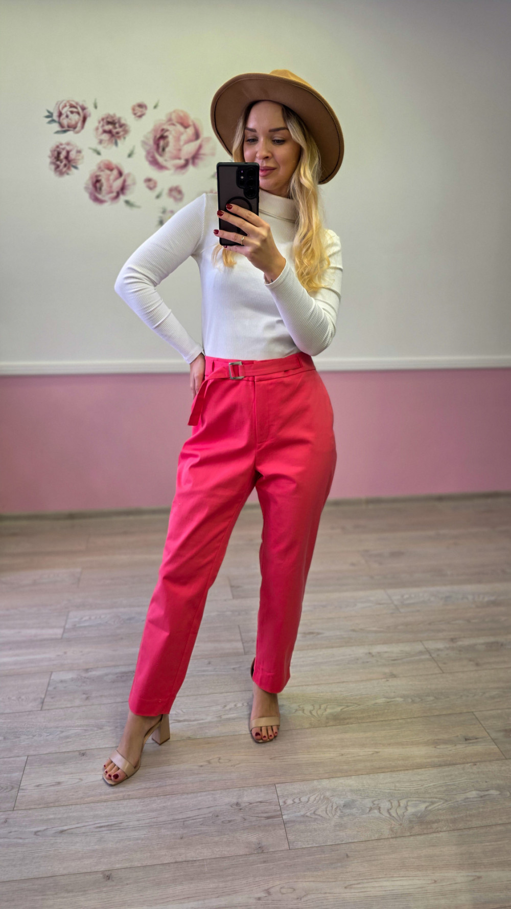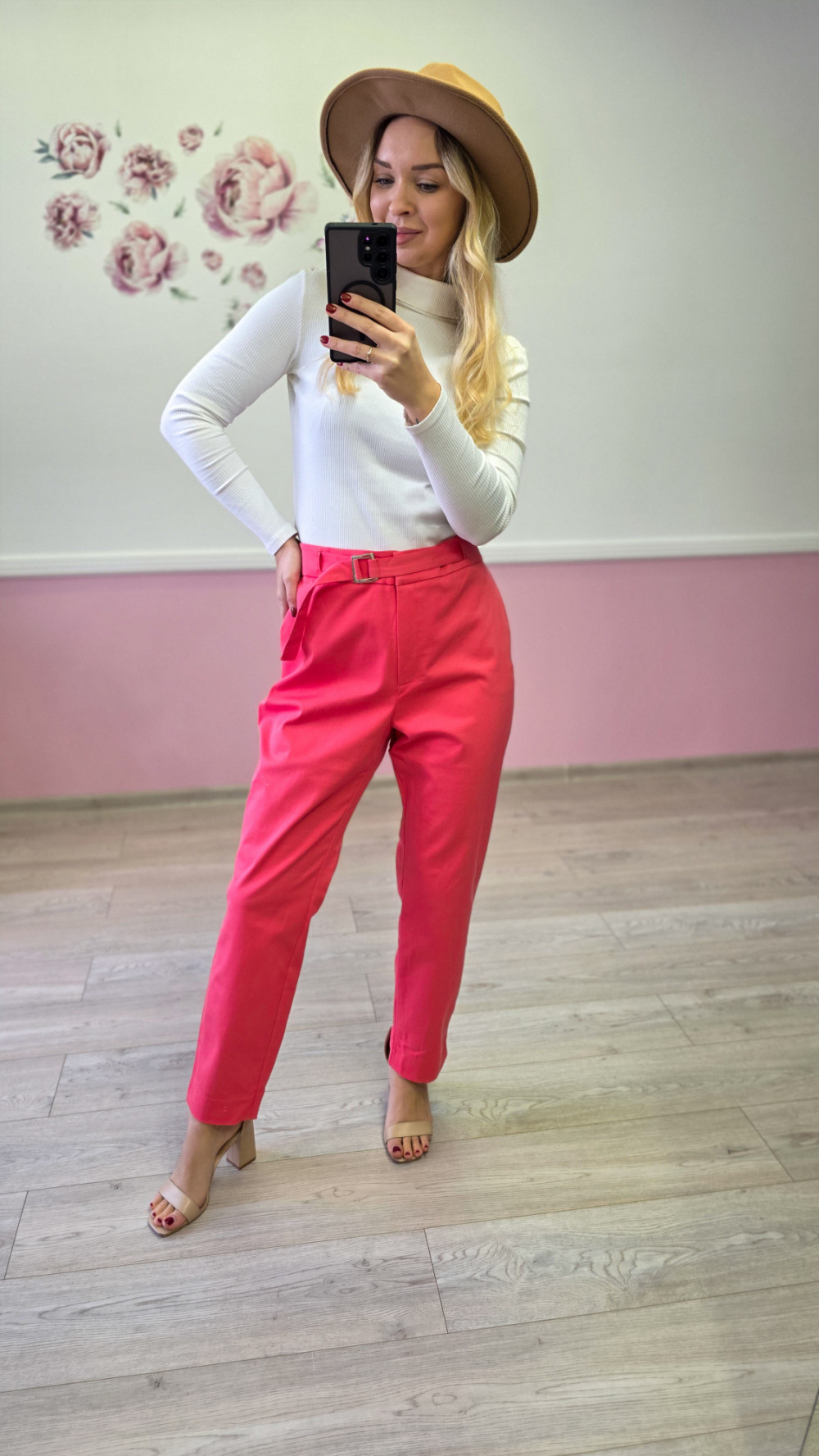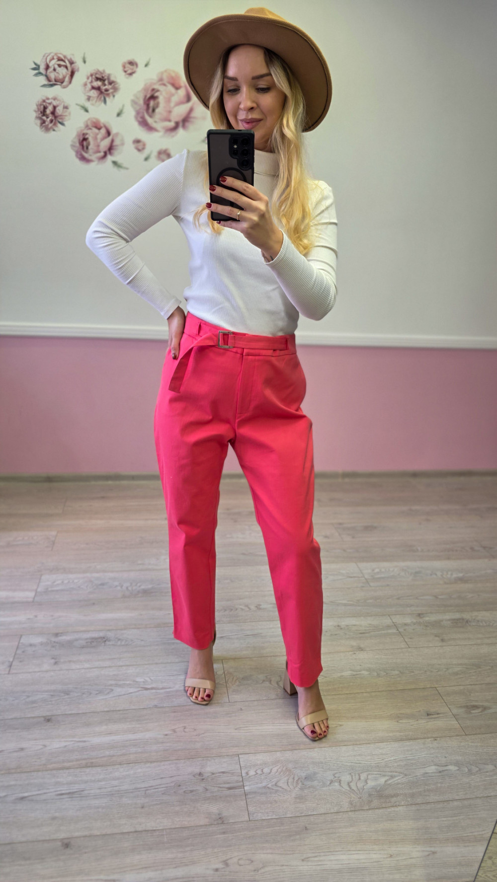 Stylowe różowe spodnie damskie to doskonała propozycja dla kobiet, które cenią modny, a jednocześnie elegancki wygląd. Wysoki stan pięknie podkreśla talię i optycznie wydłuża sylwetkę, a klasyczny fason zapewnia komfort noszenia przez cały dzień. Delikatny, różowy odcień dodaje stylizacji świeżości i kobiecego charakteru, sprawiając, że całość prezentuje się lekko i nowocześnie.