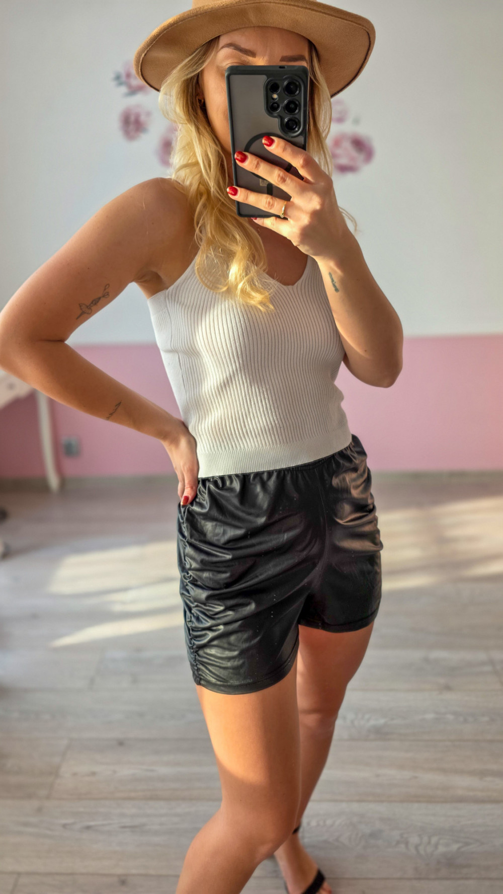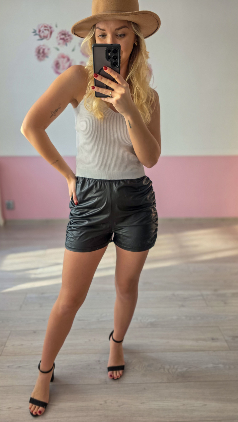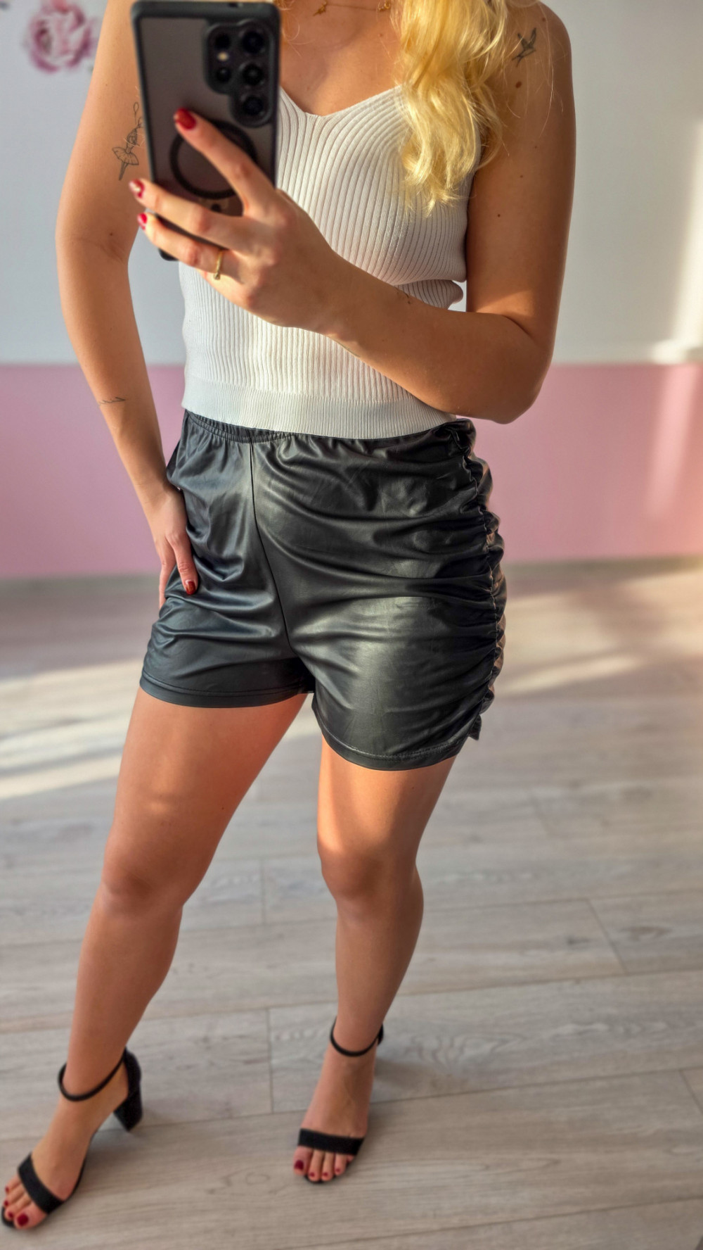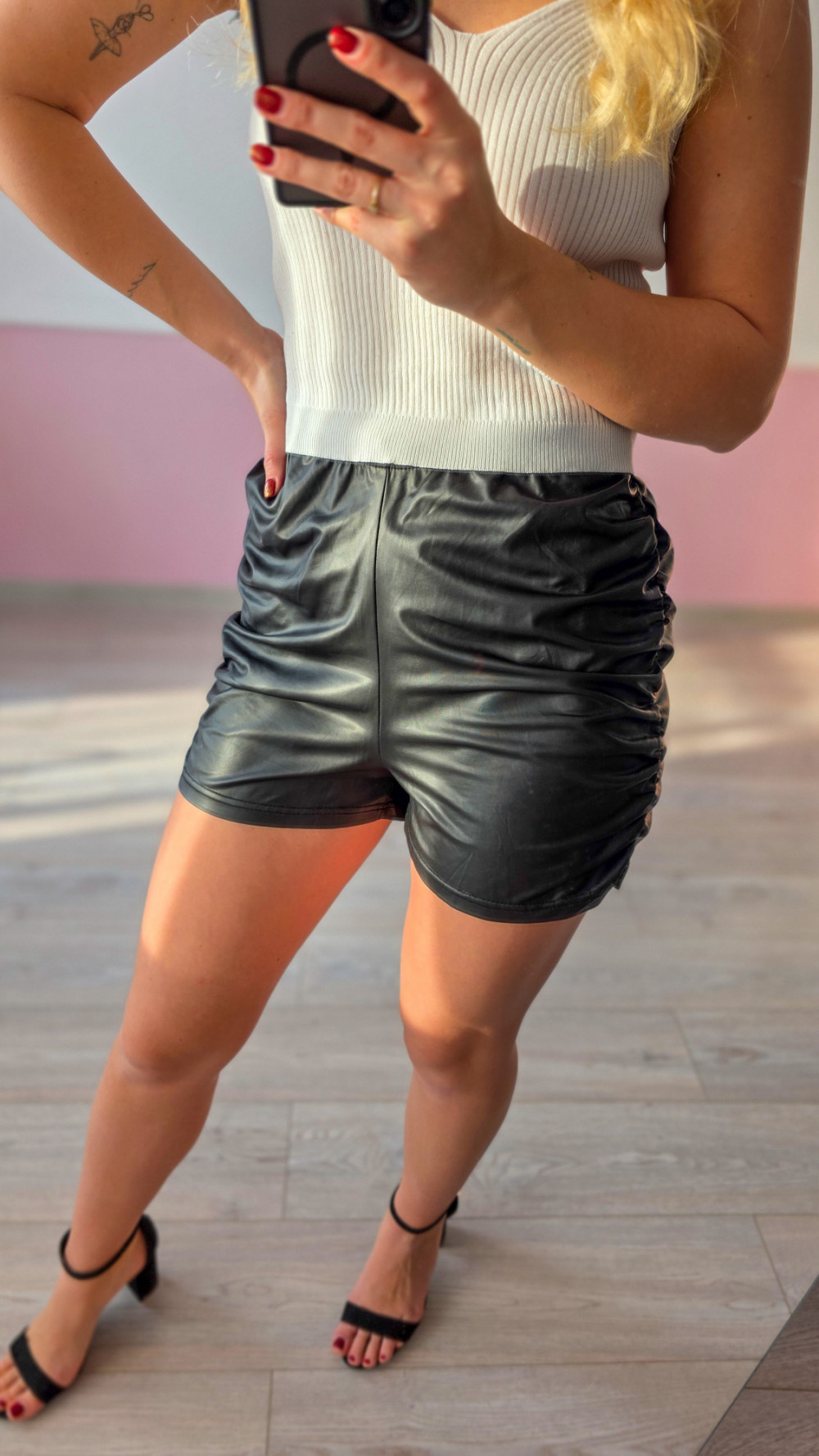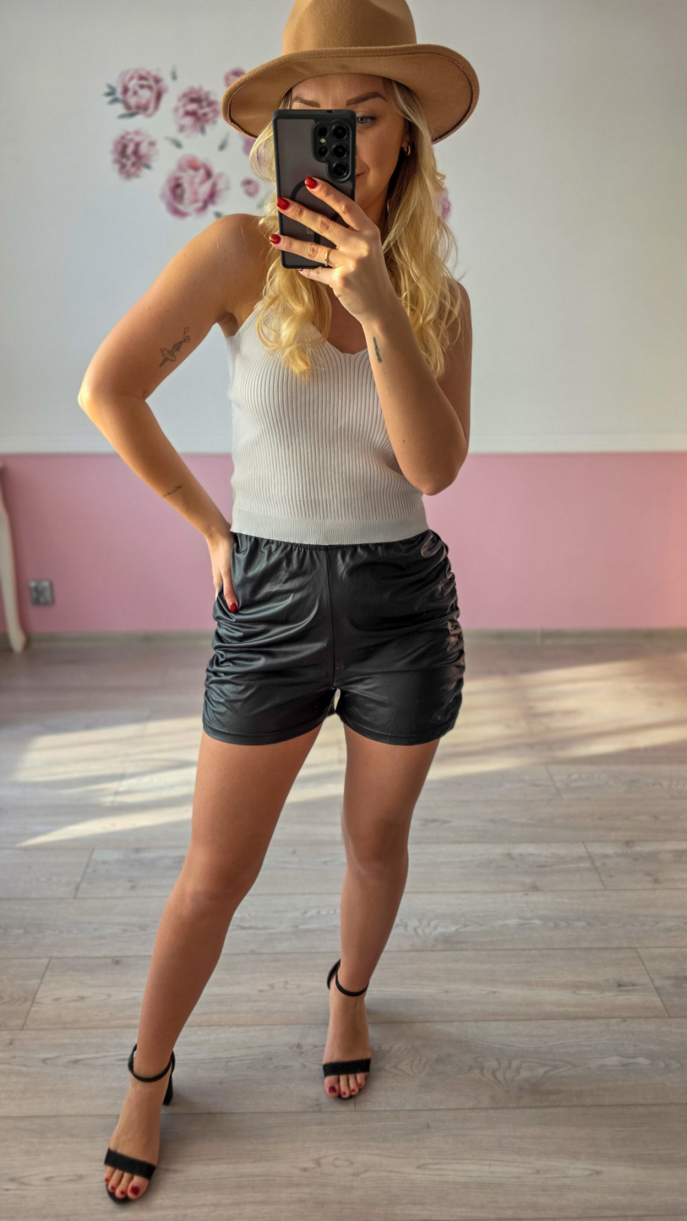 Czarne damskie spodenki z ekoskóry z marszczeniami na bokach