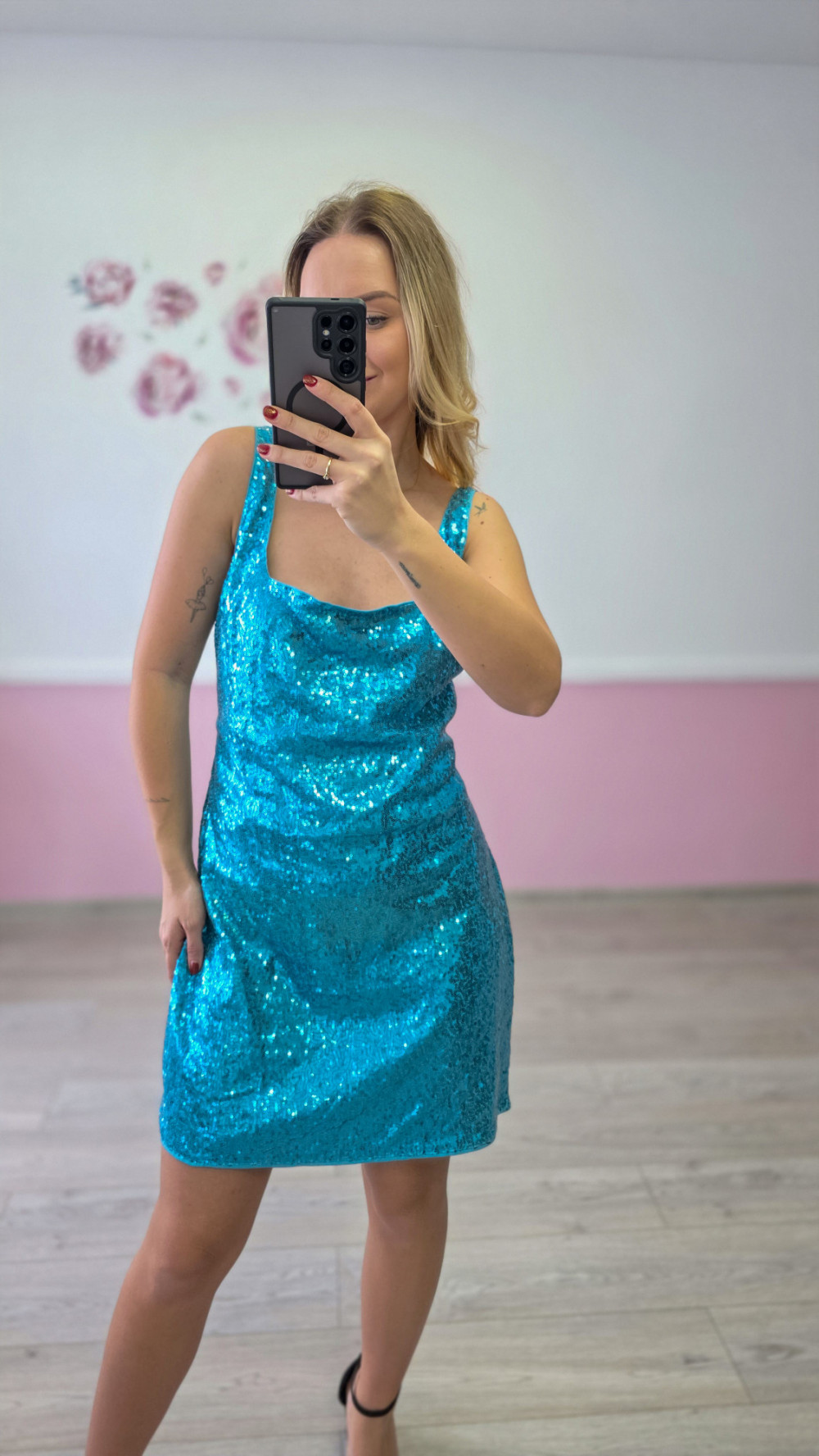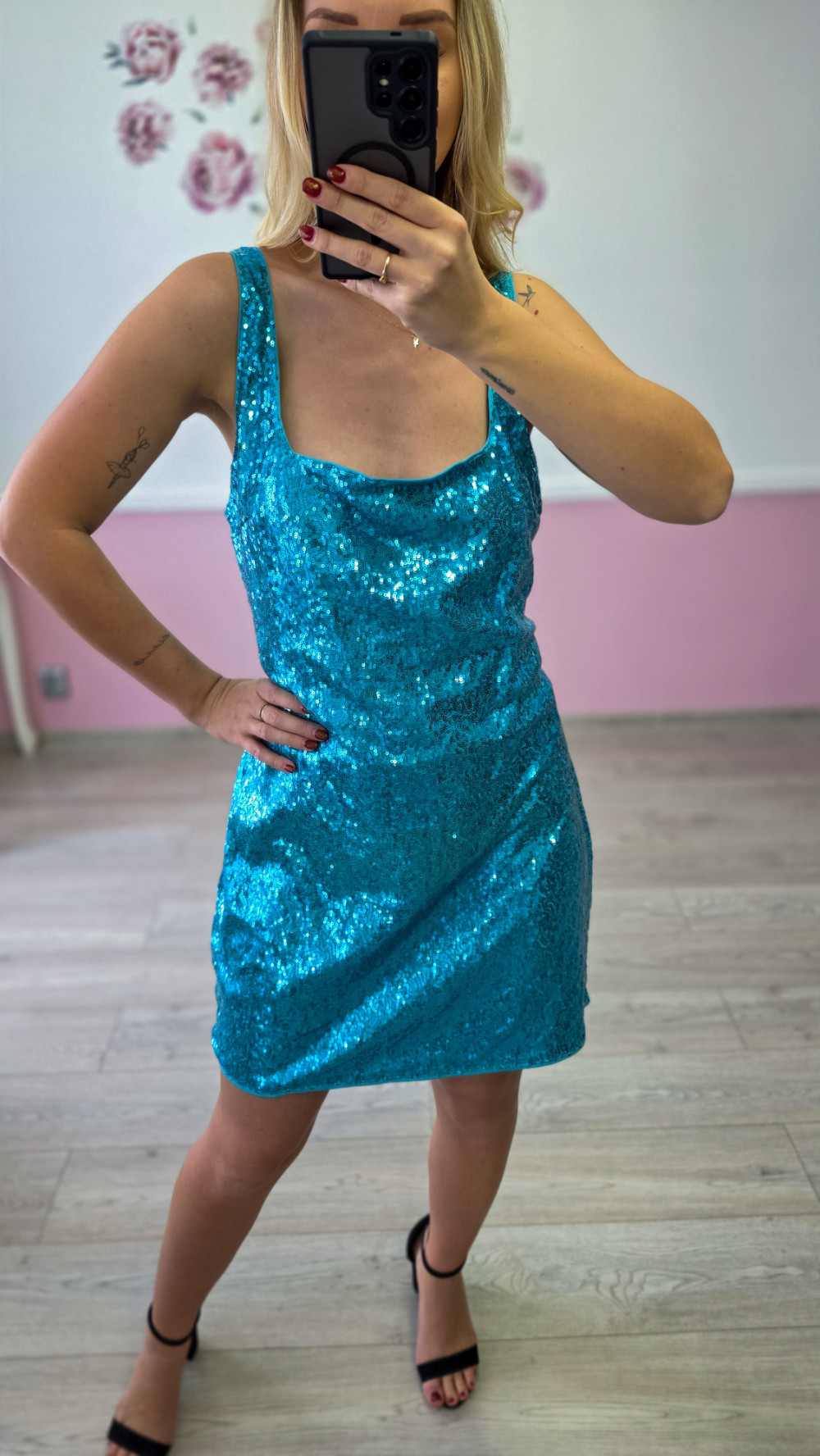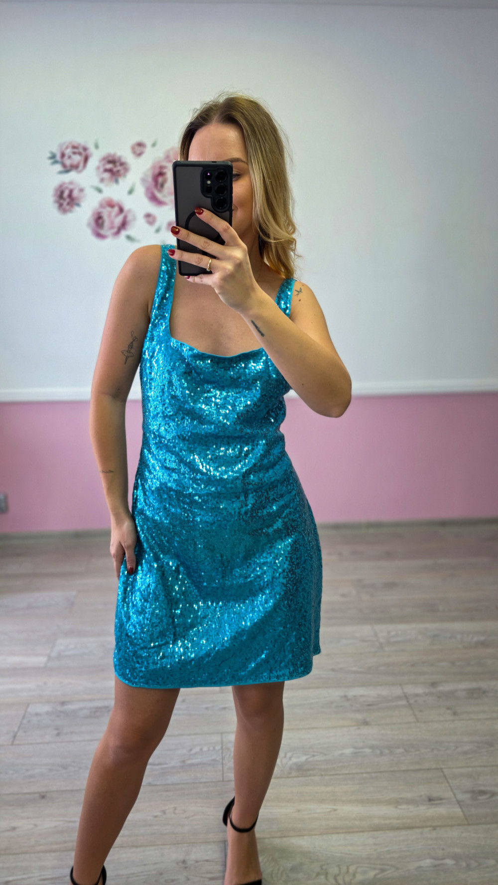 Turkusowa cekinowa sukienka mini – połyskująca sukienka na imprezę